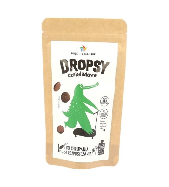 Dropsy czekoladowe bez dodatku cukru marki Pięć Przemian to małe krople ciemnej czekolady (min. 60% masy kakaowej), idealne do pieczenia, deserów, granoli czy owsianek. Słodzone erytrytolem, z dodatkiem błonnika (inuliny), produkt obniża ładunek glikemiczny w porównaniu z tradycyjną czekoladą. Intensywny, czekoladowy smak i wygodna forma sprawiają, że doskonale sprawdza się w kuchni i jako zdrowa przekąska.